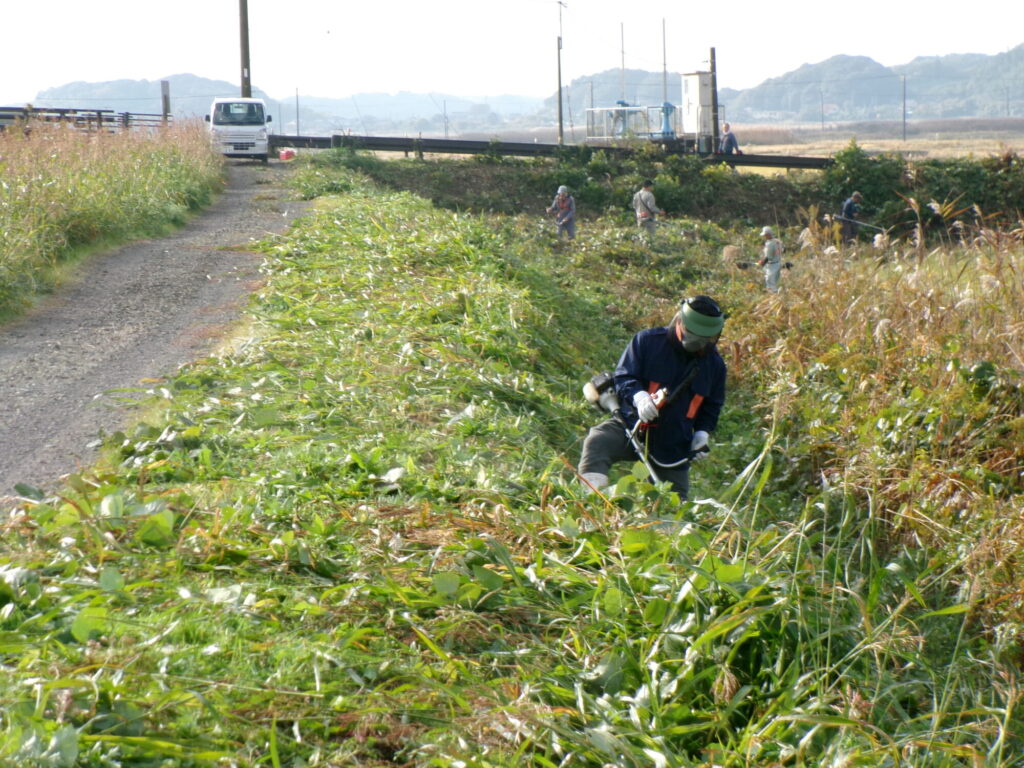 11月も2回の実践活動を行いました。1回目は十日川斜面(田んぼ側)とJA倉庫前用排水路沿い農道の草刈り・伐採作業です。十日川斜面では草は生い茂り、樹木も大きく成長していました。長期にわたり放置しておくと、こうなりますね。やはり定期的に作業しないと。川面側の斜面は千葉県でやっていただけるとのこと、よろしくお願いします。倉庫前排水路沿い農道の草刈りは今年3回目です。対象の半分はトラクターが使える状況だったのでよかったです。やはり早い。